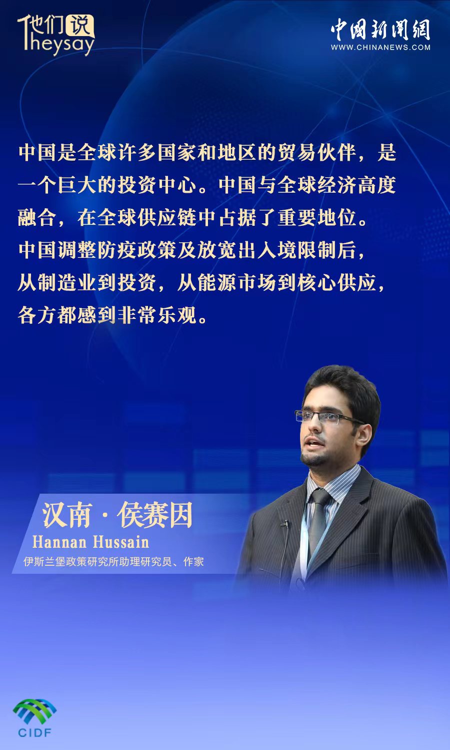 中新網(wǎng)北京3月27日電 (張乃月)“中國將政府和公眾之間的溝通視為一大要素。這使得中國取得了其他國家期望但難以實(shí)現(xiàn)的成功——民眾與政府之間的高度信任?!卑突固挂了固m堡政策研究所(IPRI)助理研究員漢南·侯賽因近日在接受中新網(wǎng)采訪時(shí)指出,中國優(yōu)化防疫政策,給全球市場帶來了樂觀情緒。