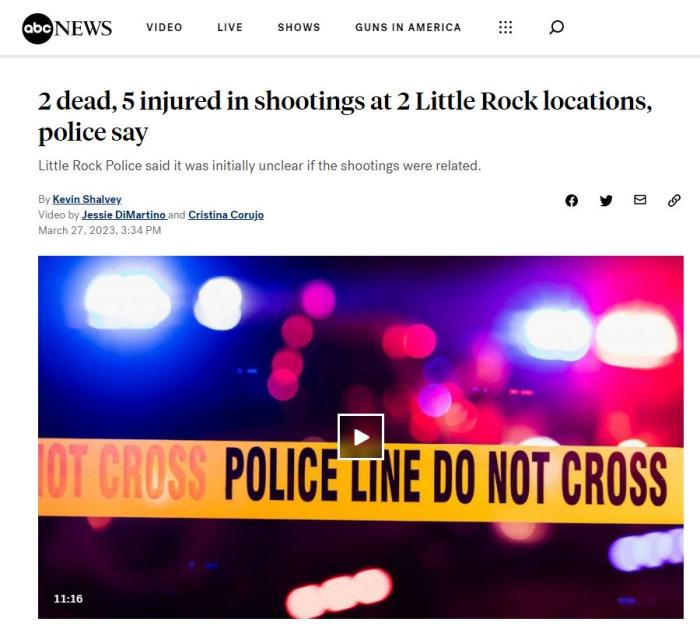 中新網(wǎng)3月27日電 據(jù)美國(guó)廣播公司(ABC)報(bào)道,當(dāng)?shù)貢r(shí)間26日晚,阿肯色州小石城發(fā)生兩起槍擊事件,造成2人死亡,5人受傷。據(jù)美國(guó)“槍支暴力檔案”網(wǎng)站27日發(fā)布的最新數(shù)據(jù)顯示,截至目前,美國(guó)2023年因槍死亡人數(shù)已接近10000人。