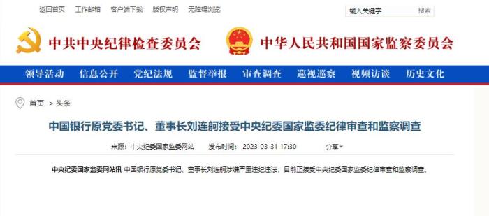 據(jù)中央紀委國家監(jiān)委網(wǎng)站3月31日消息,中國銀行原黨委書記、董事長劉連舸涉嫌嚴重違紀違法,目前正接受中央紀委國家監(jiān)委紀律審查和監(jiān)察調(diào)查。