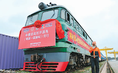 圖為2022年江西首列中俄雙向?qū)﹂_班列(南昌—莫斯科)在南昌向塘國(guó)際陸港準(zhǔn)備出發(fā)。