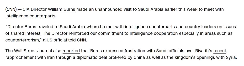 據(jù)美國有線電視新聞網(wǎng)報(bào)道,伯恩斯與沙特高級(jí)官員討論了“共同利益”,包括情報(bào)合作和反恐等問題。《華爾街日?qǐng)?bào)》文章稱,伯恩斯對(duì)沙特接受中國斡旋與伊朗復(fù)交、沙特與敘利亞走近等表示“失望”“錯(cuò)愕”,重申伊朗和敘利亞仍處于美國的制裁中。