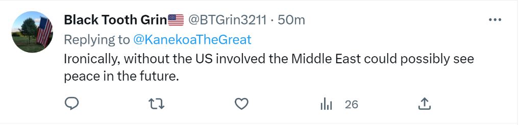 一名自我介紹是美國退役軍人的網(wǎng)友“現(xiàn)身說法”:“真諷刺,沒有美國摻和,中東或許未來就會(huì)實(shí)現(xiàn)和平。