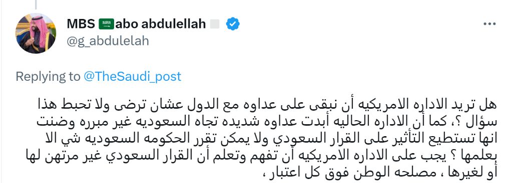 沙特網(wǎng)友阿博·阿卜杜勒拉言辭激烈地批評(píng):“只有我們與其他國家保持?jǐn)骋饷绹挪粫?huì)失望嗎?美國政府對(duì)沙特表現(xiàn)出強(qiáng)烈而無理的敵意,居然還認(rèn)為它可以影響沙特的決定、沙特只能在它的指導(dǎo)下做事?美國政府必須了解,沙特的決定不依附于任何其他人。祖國的利益高于一切。