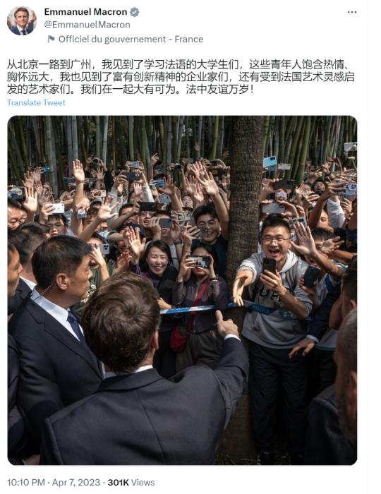 馬克龍寫(xiě)道,“從北京一路到廣州,我見(jiàn)到了學(xué)習(xí)法語(yǔ)的大學(xué)生們,這些青年人飽含熱情、胸懷遠(yuǎn)大,我也見(jiàn)到了富有創(chuàng)新精神的企業(yè)家們,還有受到法國(guó)藝術(shù)靈感啟發(fā)的藝術(shù)家們。我們?cè)谝黄鸫笥锌蔀椤7ㄖ杏颜x萬(wàn)歲!”