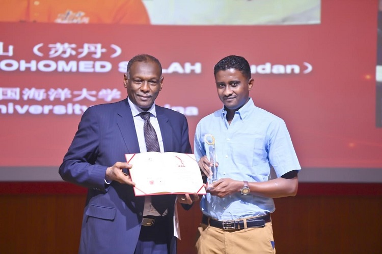蘇丹駐華大使奧馬爾·薩迪格為獲獎(jiǎng)作品導(dǎo)演霍山頒獎(jiǎng)。北京師范大學(xué)提供圖片