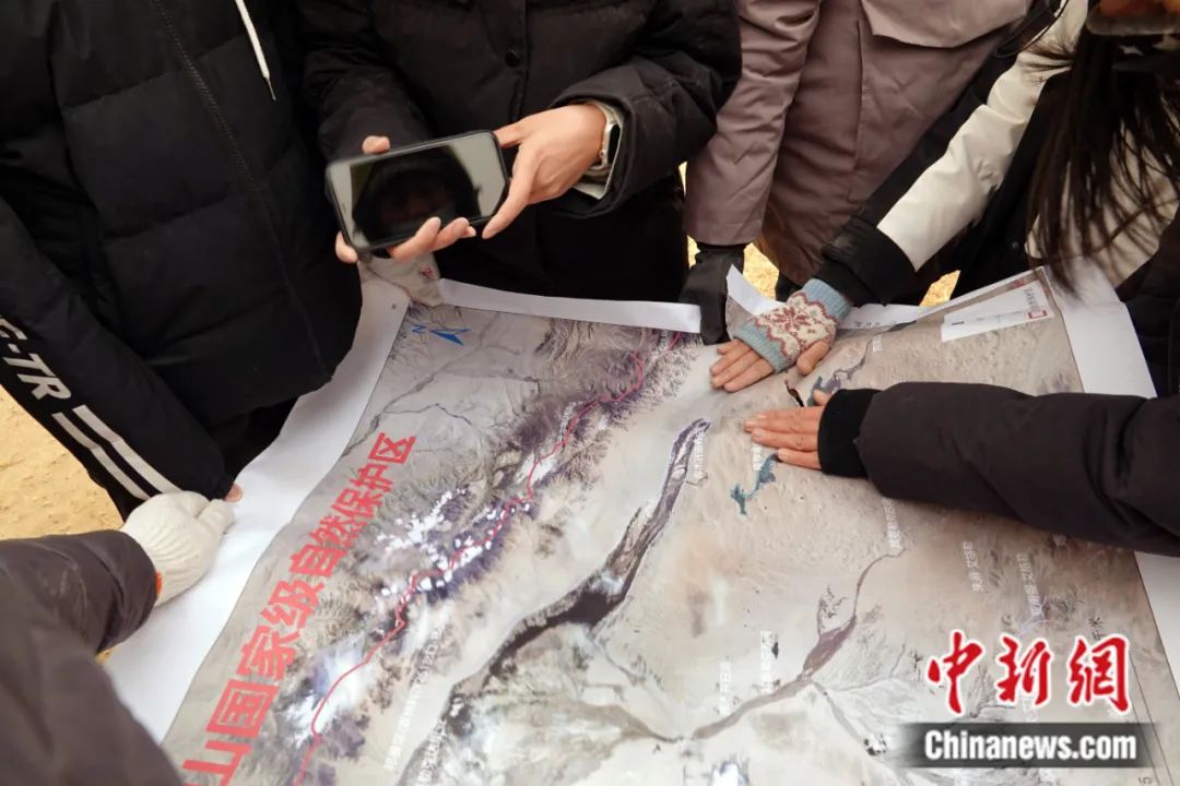 2023年4月,第三次新疆科考阿爾金山野外科考隊一行,前往阿爾金山國家級自然保護(hù)區(qū)庫木庫里沙漠的沙子泉考察調(diào)研,遭遇強(qiáng)沙塵暴天氣,科考隊員查看地圖。孫自法 攝