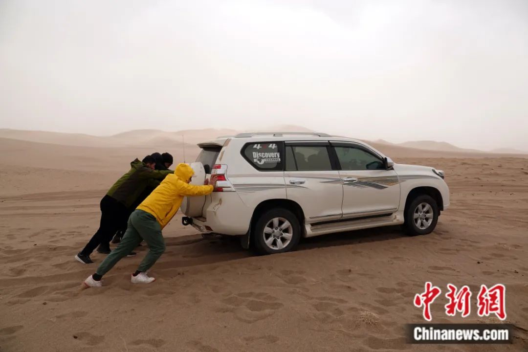 2023年4月,第三次新疆科考阿爾金山野外科考隊一行,前往阿爾金山國家級自然保護(hù)區(qū)庫木庫里沙漠的沙子泉考察調(diào)研,遭遇強(qiáng)沙塵暴天氣,科考隊員推車。孫自法 攝