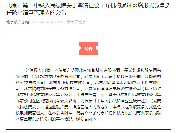 經(jīng)債權(quán)人申請,北京市第一中級人民法院裁定受理北京知旬科技有限公司、秉誠能源控股集團有限公司、金江水力發(fā)電集團有限公司、君泰創(chuàng)新(北京)科技有限公司、漢能新材料科技有限公司、北京知乘科技有限公司、北京漢能薄膜太陽能電力工程有限公司、北京精誠鉑陽光電設備有限公司、北京漢能薄膜發(fā)電投資有限公司破產(chǎn)清算一案。