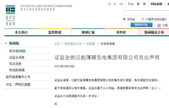 2015年5月28日,香港證監(jiān)會發(fā)表聲明稱,已就漢能薄膜發(fā)電的事務進行調(diào)查。2015年7月15日,漢能薄膜發(fā)電遭香港證監(jiān)會勒令停牌。