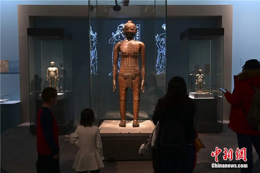 參觀者在中國(guó)國(guó)家博物館“智慧之光——中醫(yī)藥文化展”上觀看明仿宋針灸銅人。田雨昊 攝