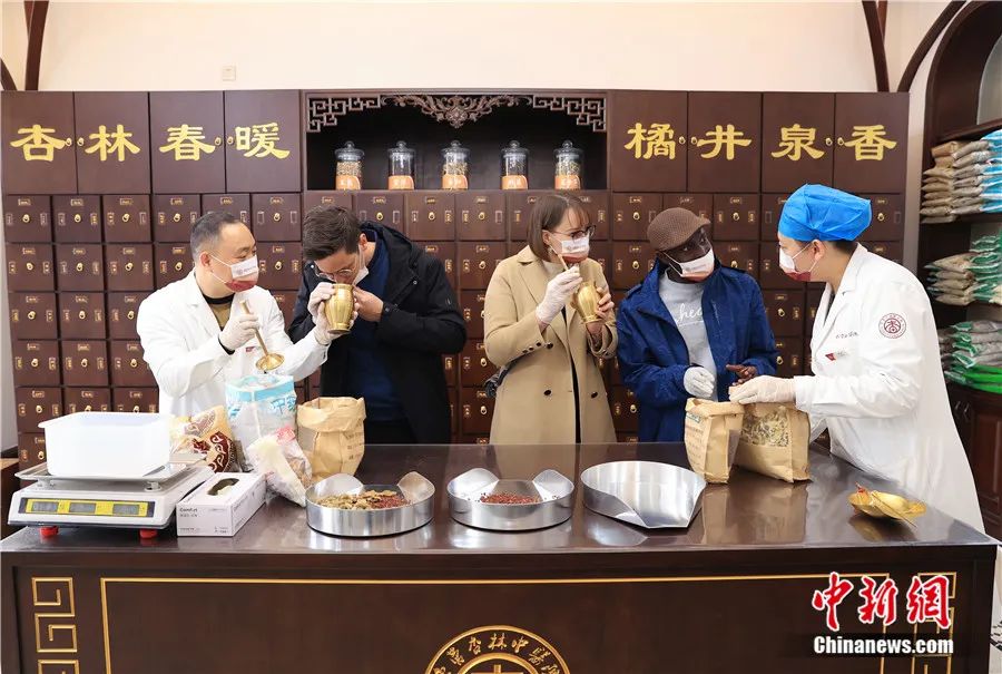 來自比利時(shí)、白俄羅斯和加納的外國(guó)友人在山東東營(yíng)一家中醫(yī)醫(yī)院的中藥房識(shí)別、稱量中藥材。周廣學(xué) 攝