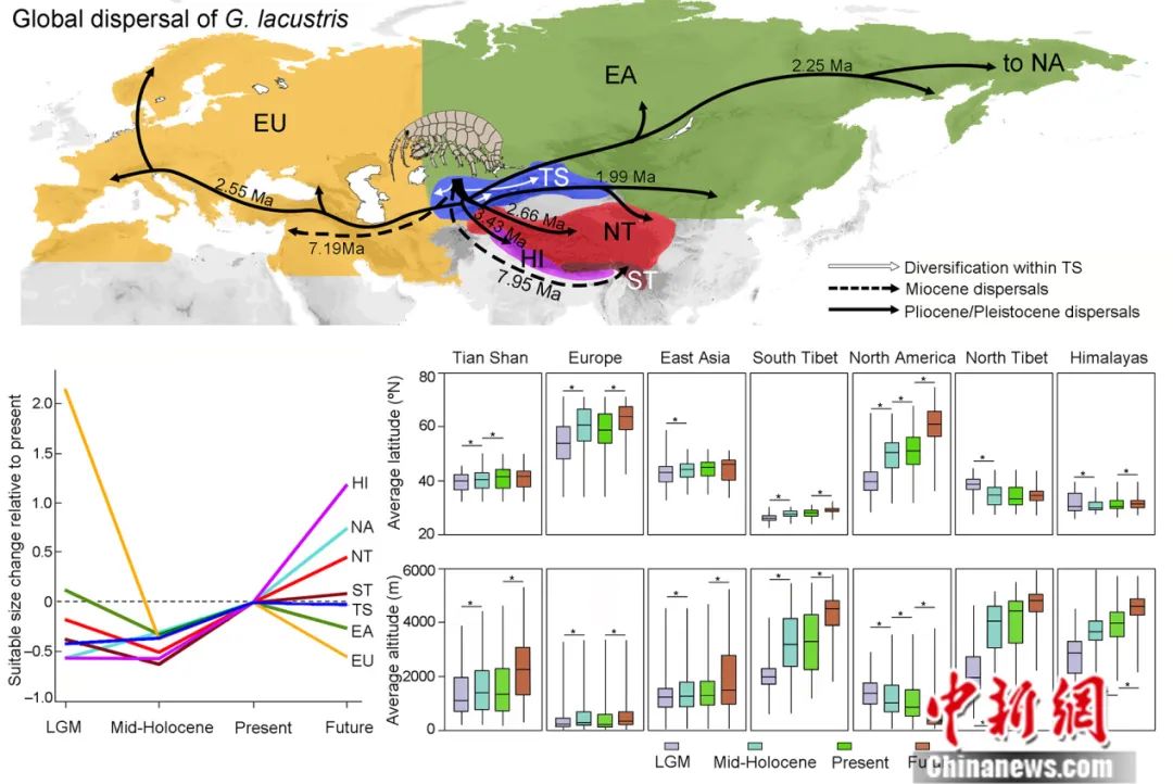此次野外調(diào)查研究發(fā)現(xiàn),高山湖泊是冷水性鉤蝦全球遷移擴展的通道,更新世氣候變冷形成大量高山湖泊或冰川湖,驅(qū)動鉤蝦多次從天山拓殖到全球高山湖泊以及環(huán)北寒帶冰川湖泊中,該研究定義這種新的分化方式為“出芽式分化”。研究還發(fā)現(xiàn),未來氣候變暖將導(dǎo)致鉤蝦局限在更高海拔更高緯度,造成遺傳多樣性降低。