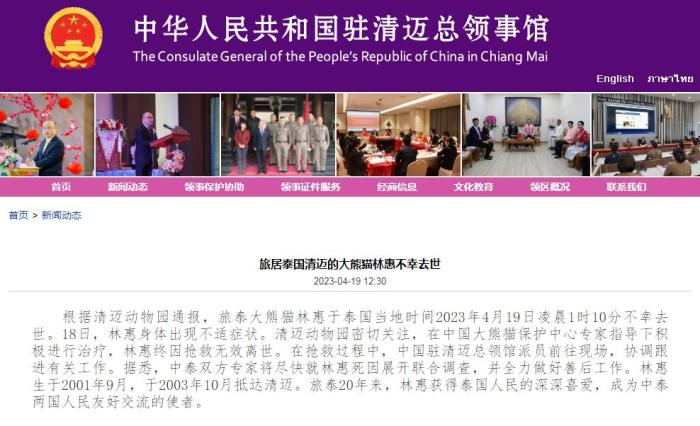 中新網(wǎng)4月19日電 據(jù)中國駐清邁總領(lǐng)事館消息,根據(jù)清邁動(dòng)物園通報(bào),旅泰大熊貓林惠于泰國當(dāng)?shù)貢r(shí)間2023年4月19日凌晨1時(shí)10分不幸去世。