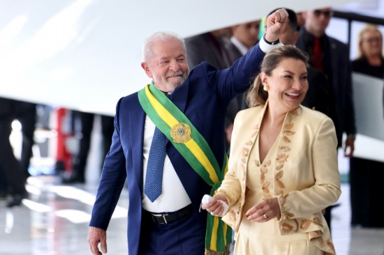 1月1日,在巴西首都巴西利亞,巴西總統(tǒng)盧拉(左)身披象征總統(tǒng)權(quán)力的綬帶向支持者揮手示意。(新華社記者劉彬攝)
