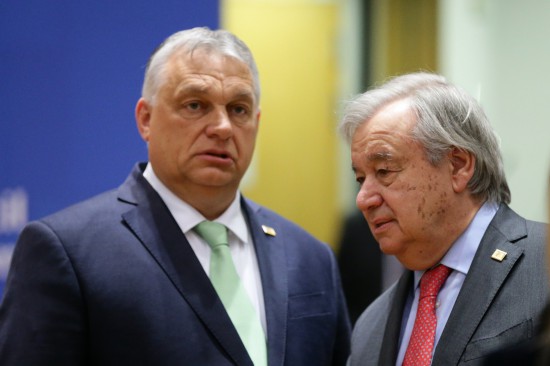 3月23日,在比利時(shí)布魯塞爾的歐盟總部,聯(lián)合國秘書長古特雷斯(右)與匈牙利總理歐爾班在歐盟峰會(huì)開始前交談。(新華社記者鄭煥松攝)