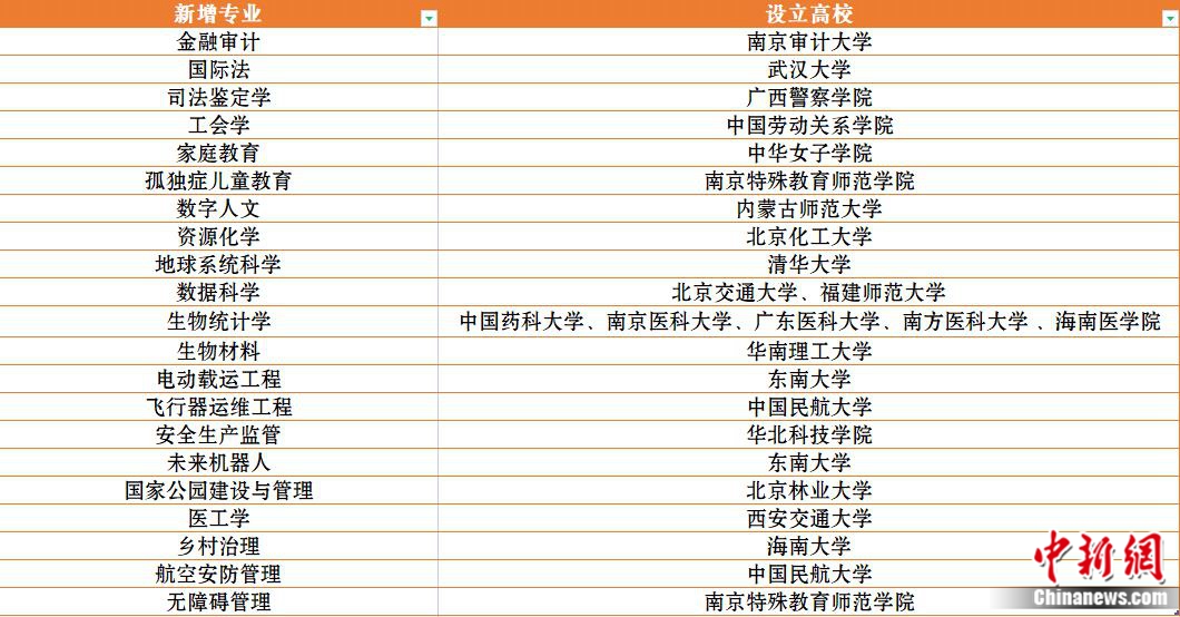 記者梳理發(fā)現(xiàn),21種新專業(yè)涉及10大類,包括金融審計、國際法、司法鑒定學、工會學、家庭教育、孤獨癥兒童教育、數(shù)字人文、資源化學、地球系統(tǒng)科學、數(shù)據(jù)科學、生物統(tǒng)計學、生物材料、電動載運工程、飛行器運維工程、安全生產(chǎn)監(jiān)管、未來機器人、國家公園建設(shè)與管理、醫(yī)工學、鄉(xiāng)村治理、航空安防管理、無障礙管理。
