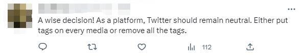 對(duì)推特的最新變化,有網(wǎng)友表示歡迎。“一個(gè)明智的決定!作為一個(gè)平臺(tái),推特應(yīng)該保持中立。要么給每個(gè)媒體上都打標(biāo)簽,要么刪除所有標(biāo)簽?!?/p>