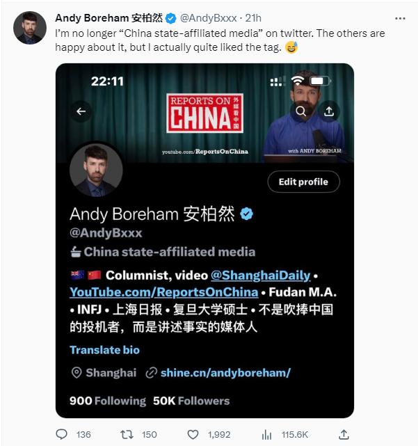 在上海工作生活了近10年的新西蘭媒體人安柏然寫(xiě)道,“我不再是推特上的‘中國(guó)官方媒體’了。其他人對(duì)此很高興,但我其實(shí)很喜歡這個(gè)標(biāo)簽。”