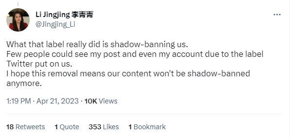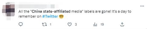 有網(wǎng)友稱(chēng),“所有‘中國(guó)官方媒體’的標(biāo)簽都消失了!這是推特上值得紀(jì)念的一天?!?/p>