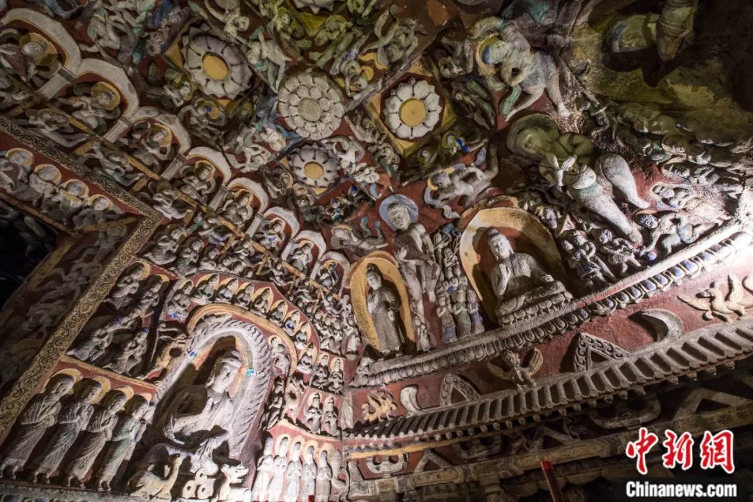 云岡石窟第12窟又名“音樂(lè)窟”,前殿上壁雕塑的數(shù)十身伎樂(lè)天人形象正在演奏琵琶、篳篥、古琴等各種中西式樂(lè)器,是中國(guó)古代最早的宮廷交響樂(lè)團(tuán)。武俊杰 攝