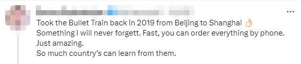還有網友說,“2019年坐高鐵從北京到上海。一些事我永遠不會忘記。速度很快。太棒了。很多國家可以向他們學習?!?/p>