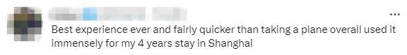 有網友介紹說,“最好的體驗,比坐飛機要快得多,我在上海呆了4年,坐過很多次。”