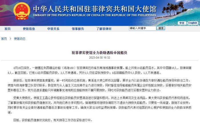 中新網(wǎng)4月30日電 據(jù)中國駐菲律賓大使館網(wǎng)站消息,4月28日深夜,一艘塞拉利昂籍運砂船(鴻海189)在菲律賓巴丹省東南海域遇事故傾覆。船上共有20名船員落水,其中中國籍16人,菲律賓籍4人。截至目前,已有12名中國船員獲救,2人不幸遇難,另外2人仍在緊張搜救中;4名菲籍船員中3人獲救,1人不幸遇難。