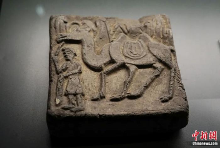 青海省博物館展出的青海湟中出土的“胡人牽駝模印墓磚”。中新社記者 馬銘言 攝