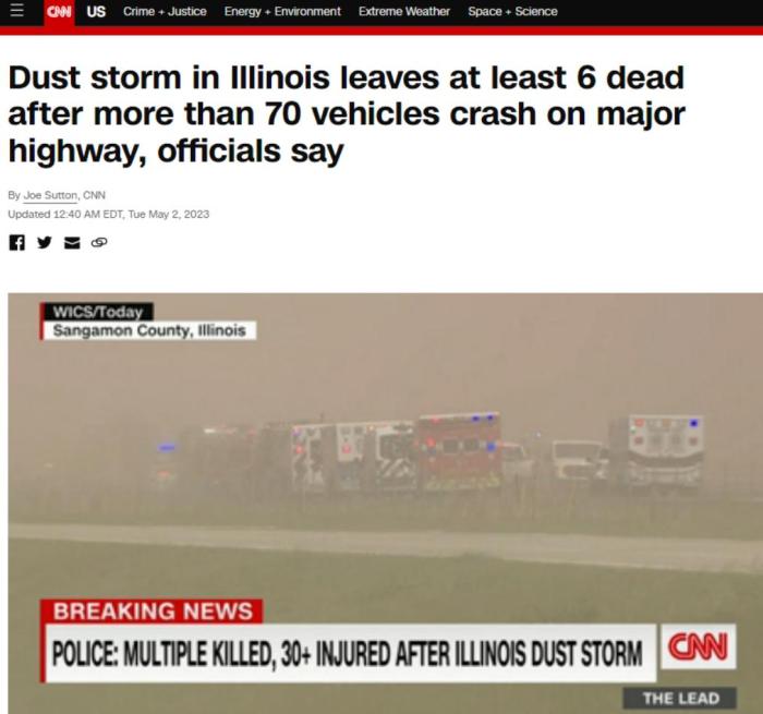中新網(wǎng)5月2日電 綜合美媒消息,當(dāng)?shù)貢r(shí)間5月1日,由于沙塵暴導(dǎo)致能見度降低,70余輛汽車在美國伊利諾伊州55號州際公路蒙哥馬利縣法默斯維爾鎮(zhèn)附近路段相撞,事故已造成至少6人死亡,37人受傷入院。