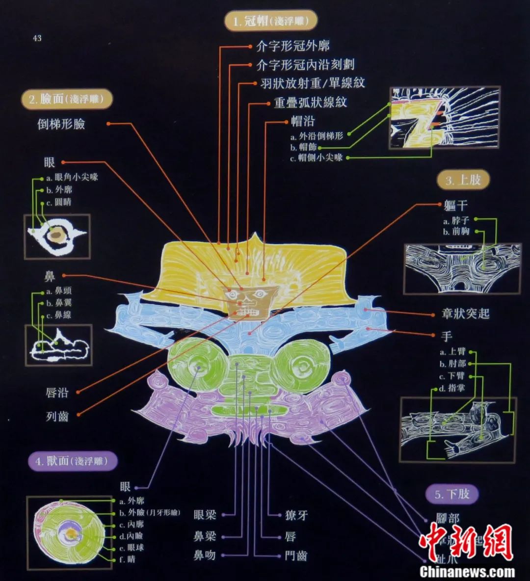 這個圖案的主體為“神人”,面部呈倒梯形,眼睛、鼻子、牙齒都非常寫實?!吧袢恕鳖^上還戴有高聳的羽冠,內(nèi)層刻有連續(xù)卷云紋的帽飾,外層為放射狀羽翎大冠。“神人”的四肢都以陰紋細刻而成,上肢作抬臂、彎肘狀,五指平張。“神人”的身下是一只伏在地上的神獸(形似老虎),外框有橢圓形的眼瞼,之間以橋形凸面相連,有鼻梁和鼻翼,闊嘴內(nèi)有尖利的牙齒。