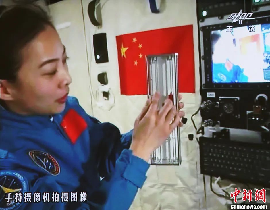 2013年6月20日10時(shí)許,神舟十號(hào)航天員在天宮一號(hào)開(kāi)展基礎(chǔ)物理實(shí)驗(yàn),為青少年進(jìn)行中國(guó)首次太空授課。圖為王亞平講授質(zhì)量測(cè)量。中新社發(fā) 秦憲安 攝