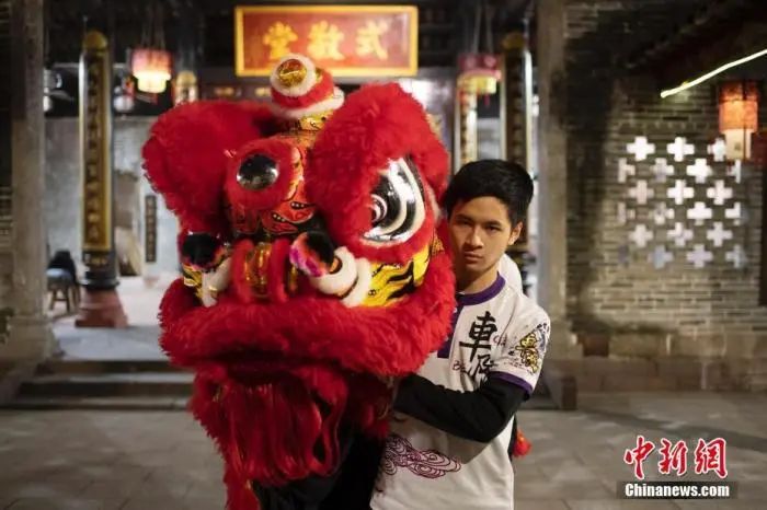 圖為2022年1月18日晚,廣州市天河區(qū)車(chē)陂龍獅體育會(huì)舞獅隊(duì)隊(duì)員王智銘在晴川蘇公祠拿著一頭紅獅。王智銘是一名“00后”,學(xué)習(xí)舞獅已3年,他說(shuō)自己的目標(biāo)是“世界獅王”。 中新社記者 陳楚紅 攝