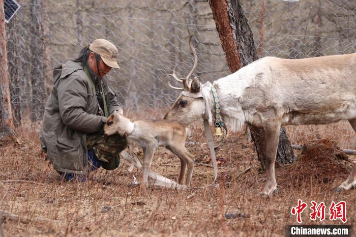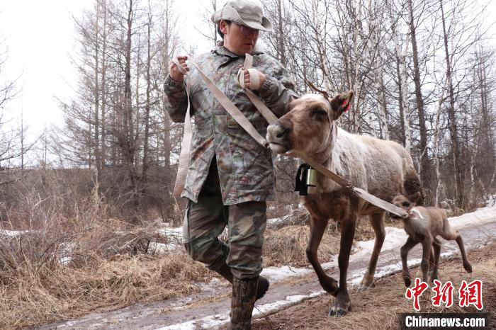 4月中下旬,敖魯古雅鄂溫克使鹿部落進(jìn)入馴鹿集中產(chǎn)仔季,達(dá)琳瑪正在拴剛出生的小鹿。(根河市融媒體中心供圖)