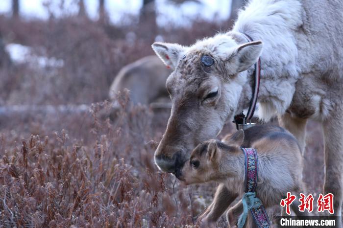 4月中旬至5月下旬是馴鹿集中產(chǎn)仔季,馴鹿媽媽與鹿寶寶親密互動(dòng)。(根河市融媒體中心供圖)