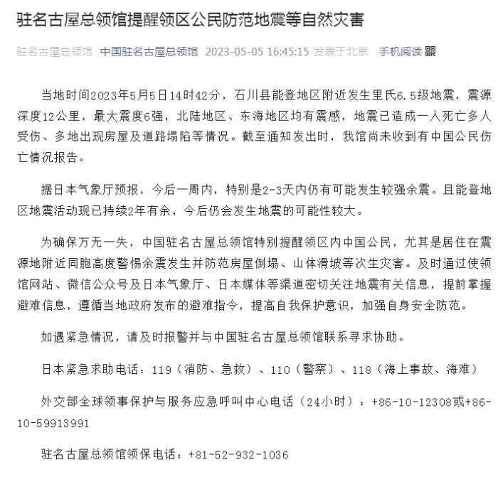 為確保萬無一失,中國駐名古屋總領(lǐng)館特別提醒領(lǐng)區(qū)內(nèi)中國公民,尤其是居住在震源地附近同胞高度警惕余震發(fā)生并防范房屋倒塌、山體滑坡等次生災(zāi)害。及時通過使領(lǐng)館網(wǎng)站、微信公眾號及日本氣象廳、日本媒體等渠道密切關(guān)注地震有關(guān)信息,提前掌握避難信息,遵循當(dāng)?shù)卣l(fā)布的避難指令,提高自我保護(hù)意識,加強自身安全防范。