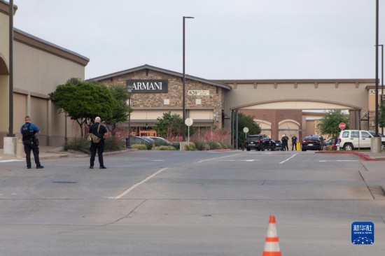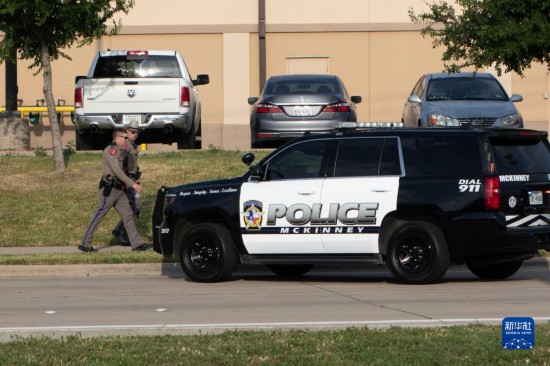 這是5月6日在美國得克薩斯州達拉斯近郊發(fā)生槍擊事件的購物中心拍攝的警察和警車。美國得克薩斯州達拉斯近郊一家購物中心6日發(fā)生槍擊事件。新華社發(fā)(田丹攝)