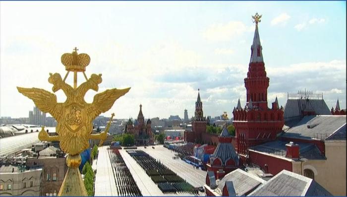 今年紅場閱兵的空中部分取消,最后一列軍事裝備沿著紅場行進完畢后,軍樂隊奏響《勝利》樂曲。莫斯科時間11時左右,紅場閱兵式在“烏拉”聲中結(jié)束。