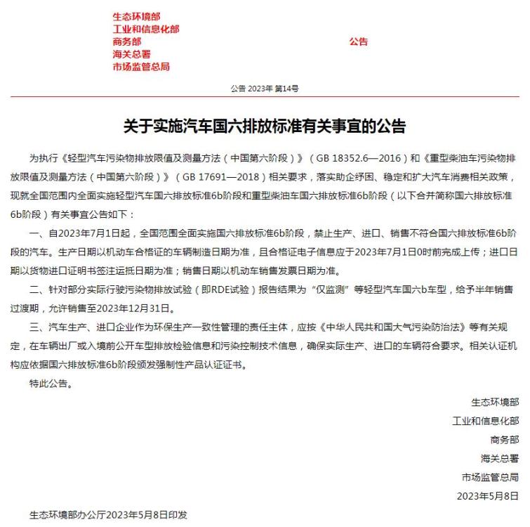 其中要求,自2023年7月1日起,全國范圍全面實施國六排放標(biāo)準(zhǔn)6b階段,禁止生產(chǎn)、進口、銷售不符合國六排放標(biāo)準(zhǔn)6b階段的汽車。生產(chǎn)日期以機動車合格證的車輛制造日期為準(zhǔn),且合格證電子信息應(yīng)于2023年7月1日0時前完成上傳;進口日期以貨物進口證明書簽注運抵日期為準(zhǔn);銷售日期以機動車銷售發(fā)票日期為準(zhǔn)。