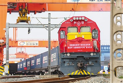 中歐班列是中法進出口貿(mào)易的重要橋梁。圖為4月26日,為紀(jì)念成都國際班列十周年而開行的“法國郵政DPD專列”在四川省成都市青白江區(qū)國際鐵路港首發(fā)。