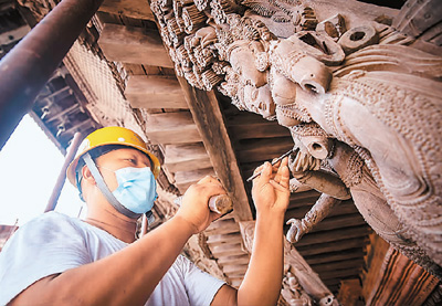 2022年,在國家文物局的指導(dǎo)下,中國文化遺產(chǎn)研究院援助尼泊爾工作隊經(jīng)過近5年努力,圓滿完成尼泊爾加德滿都杜巴廣場九層神廟建筑群文物本體維修。圖為2022年7月,工人在尼泊爾加德滿都進行九層神廟建筑群修復(fù)工作。