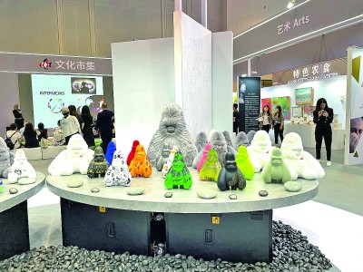 在中東歐展區(qū)的文化市集上,中國與中東歐國家的當(dāng)代藝術(shù)品同臺展出。其中,最吸引參觀者目光的,當(dāng)屬展臺正中擺放的一系列形態(tài)各異的中國藝術(shù)家原創(chuàng)IP形象“大衛(wèi)猿”雕塑或毛絨玩具。創(chuàng)作者袁澤銘介紹,本次展出的“大衛(wèi)猩球”項目邀請包括中國以及波黑、匈牙利、羅馬尼亞等中東歐國家在內(nèi)的全球藝術(shù)家為“大衛(wèi)猿”添加各自獨(dú)特的涂裝,體現(xiàn)了不同國家藝術(shù)家之間的文化交流以及藝術(shù)可能性的碰撞。