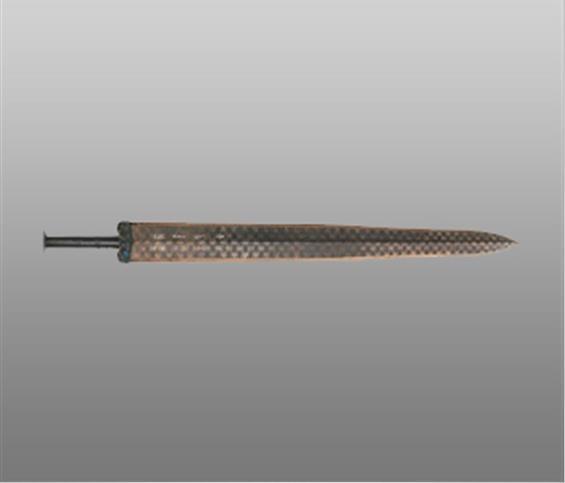 越王勾踐劍天下聞名。劍身中脊起棱,飾黑色菱形花紋。劍格正面嵌藍色琉璃,背面綠松石。歷經(jīng)兩千余年,紋飾仍然清晰精美、劍身鋒利無比。