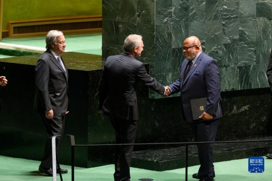6月1日,在位于紐約的聯(lián)合國總部,特立尼達(dá)和多巴哥常駐聯(lián)合國代表丹尼斯·弗朗西斯(前)當(dāng)選第78屆聯(lián)合國大會(huì)主席后發(fā)表講話。新華社發(fā)(聯(lián)合國供圖/洛伊·費(fèi)利普攝)