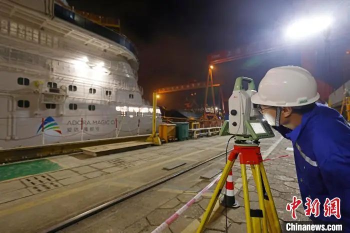 6月1日凌晨2時(shí),中國首艘國產(chǎn)大型郵輪“愛達(dá)·魔都號(hào)”開始注水起浮,工作人員對(duì)船體相關(guān)數(shù)據(jù)進(jìn)行檢測。殷立勤 攝