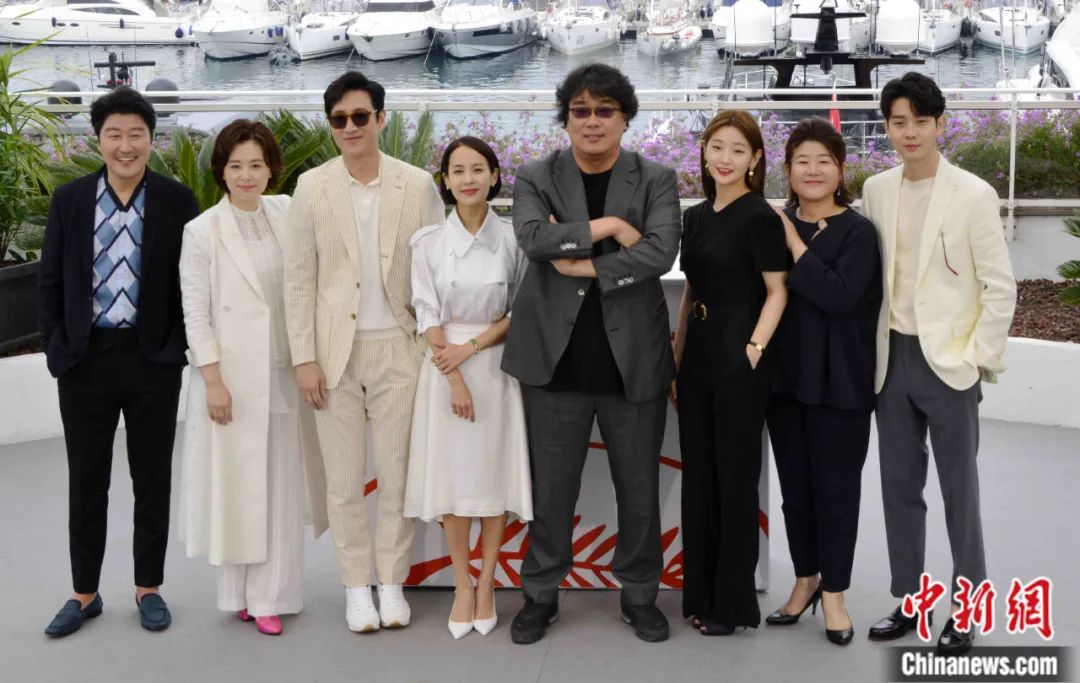 韓國(guó)影片《寄生蟲(chóng)》主創(chuàng)團(tuán)隊(duì)亮相第72屆戛納電影節(jié)。李洋 攝