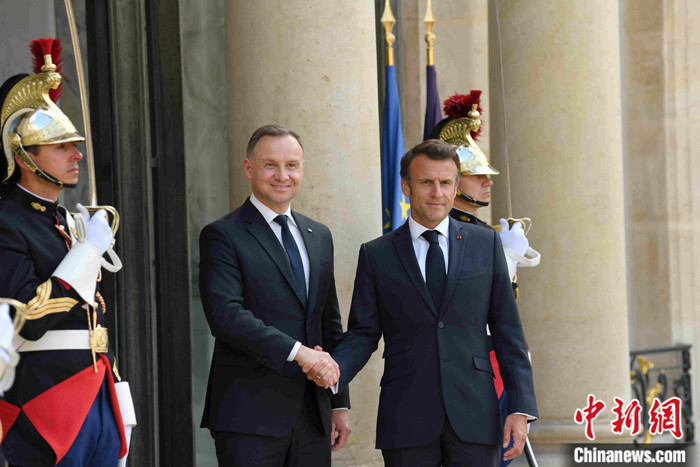 當(dāng)?shù)貢r間6月12日晚,法國總統(tǒng)馬克龍在巴黎愛麗舍宮會見波蘭總統(tǒng)杜達。杜達前來出席當(dāng)天舉行的法德波三國領(lǐng)導(dǎo)人會談。 中新社記者 李洋 攝