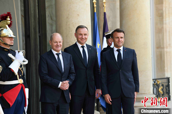 當(dāng)?shù)貢r間6月12日晚,法國總統(tǒng)馬克龍在巴黎愛麗舍宮與德國總理朔爾茨、波蘭總統(tǒng)杜達會面。他們共同出席“魏瑪三角”機制下的三國領(lǐng)導(dǎo)人會議。 中新社記者 李洋 攝