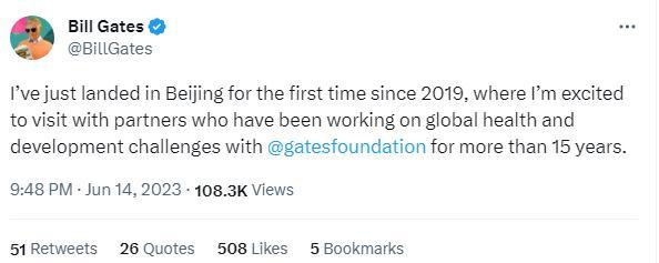 中新網(wǎng)6月14日電 北京時(shí)間14日,比爾及梅琳達(dá)·蓋茨基金會聯(lián)席主席兼理事、美國微軟公司聯(lián)合創(chuàng)始人比爾·蓋茨在社交媒體上發(fā)文稱已抵達(dá)北京。