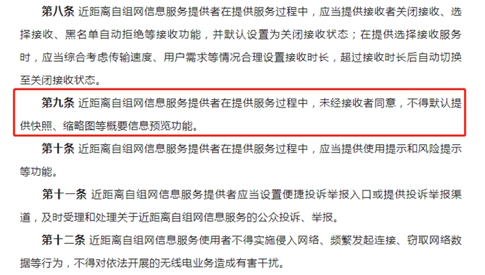 特別要注意的是,征求意見稿還提出“近距離自組網(wǎng)信息服務(wù)提供者在提供服務(wù)過(guò)程中,未經(jīng)接收者同意,不得默認(rèn)提供快照、縮略圖等概要信息預(yù)覽功能”。如前文所述,目前隔空投送存儲(chǔ)失敗選擇使用“文件”打開時(shí),在未完全接收的情況下可顯示信息縮略圖。