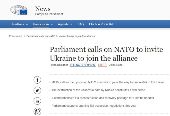 歐洲議會呼吁北約邀請烏克蘭加入。圖片來源:歐洲議會網(wǎng)站截圖
